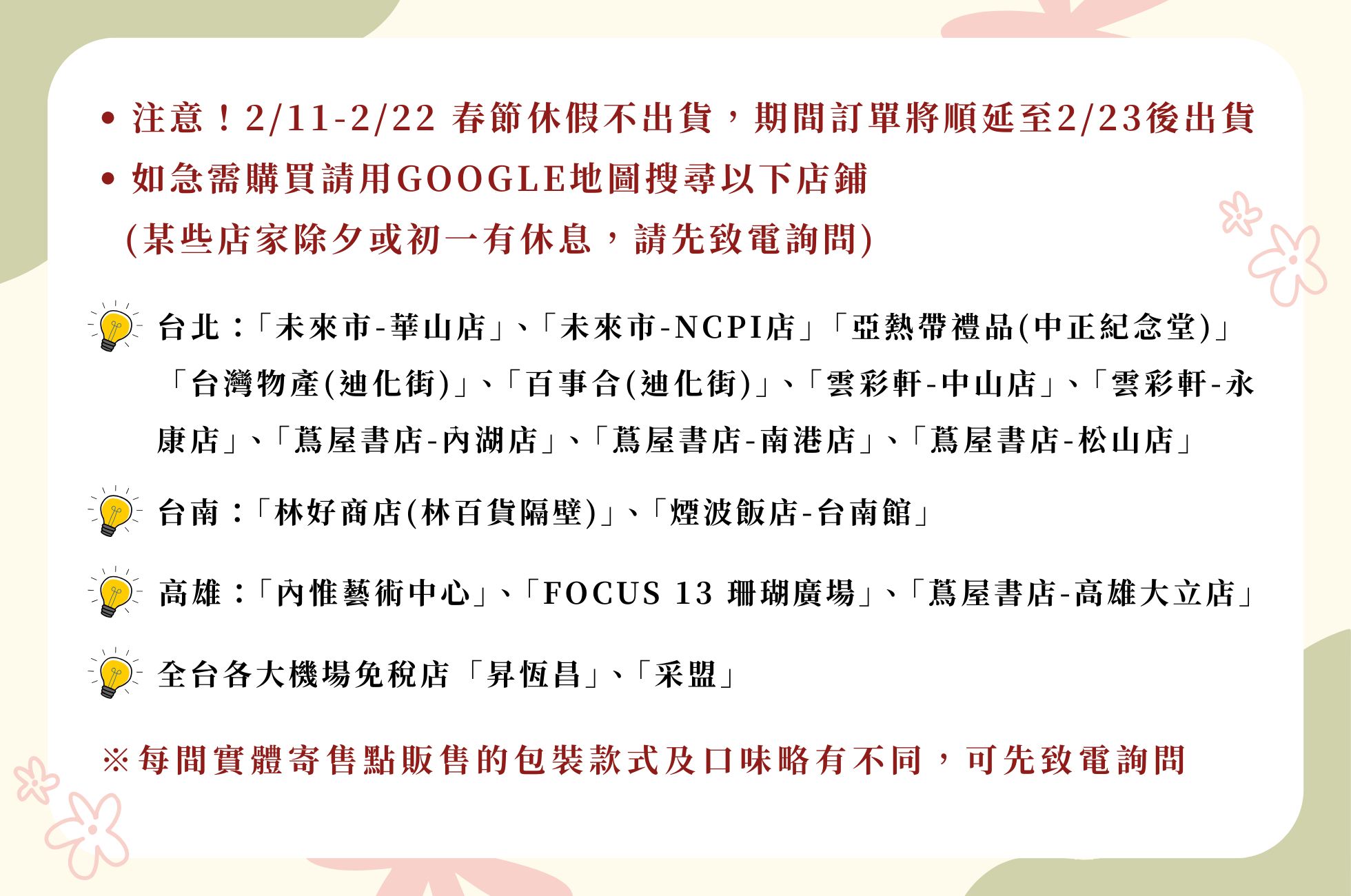 2/11-2/22春節休假不出貨,期間訂單將延至2/23後陸續寄出